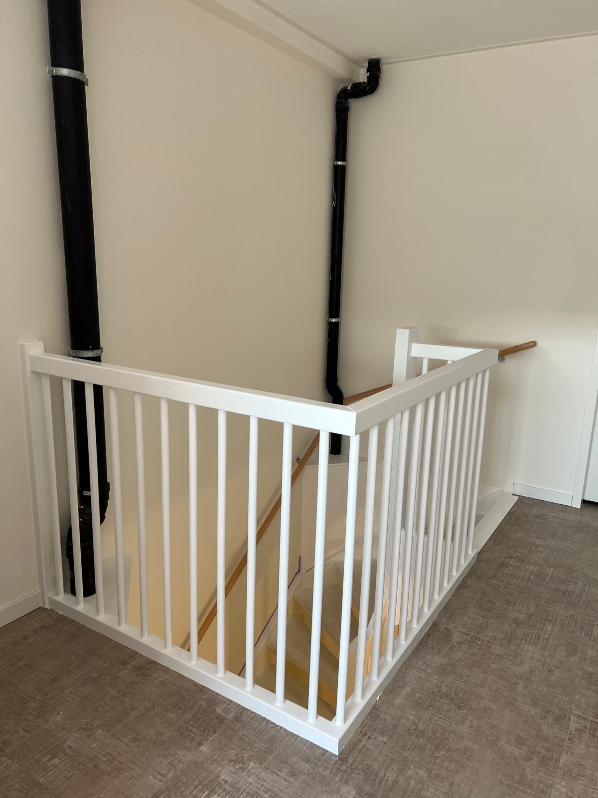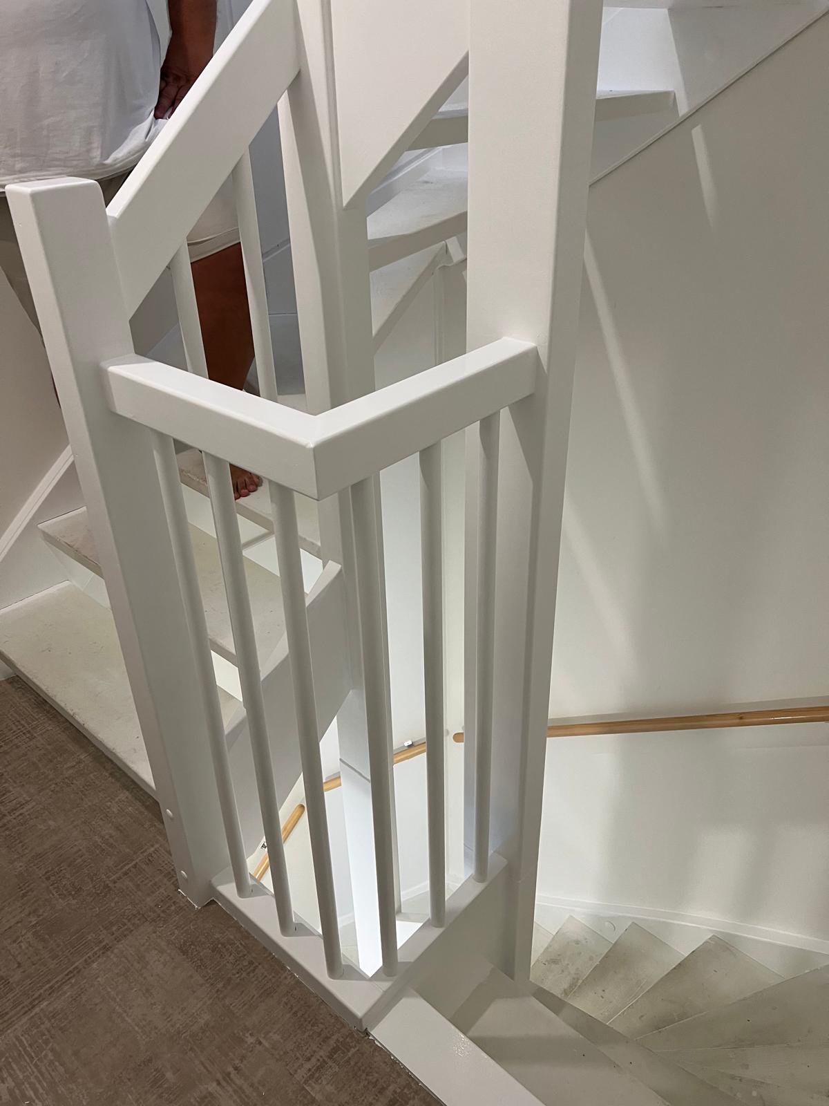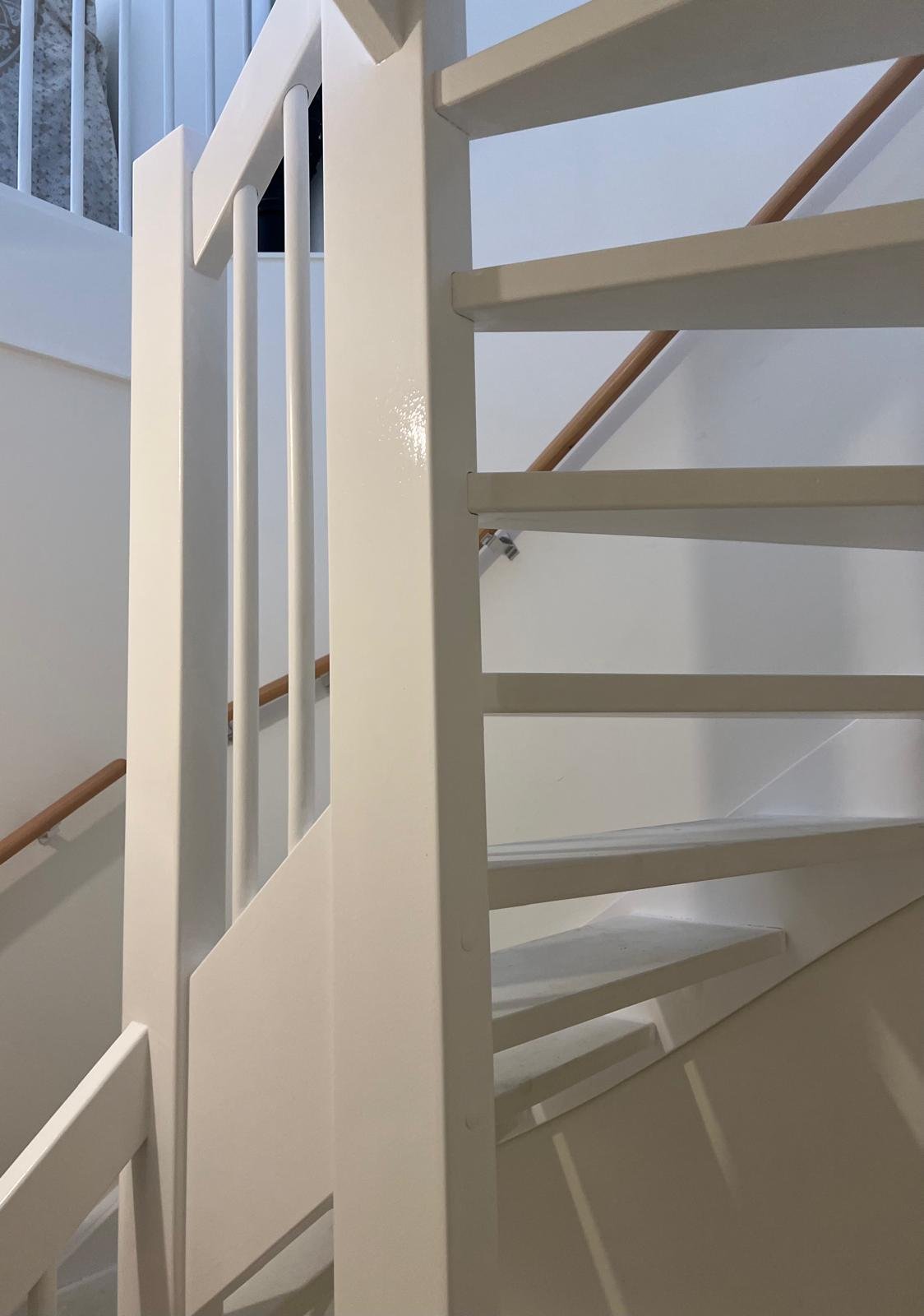 In Hazerswoude-Rijndijk zijn de traphekken en trapwangen (ook wel trapbomen genoemd) professioneel geschilderd. Na een grondige voorbereiding zijn de oppervlakken zorgvuldig schoongemaakt en in het wit afgewerkt met een duurzame zijdeglansverf.